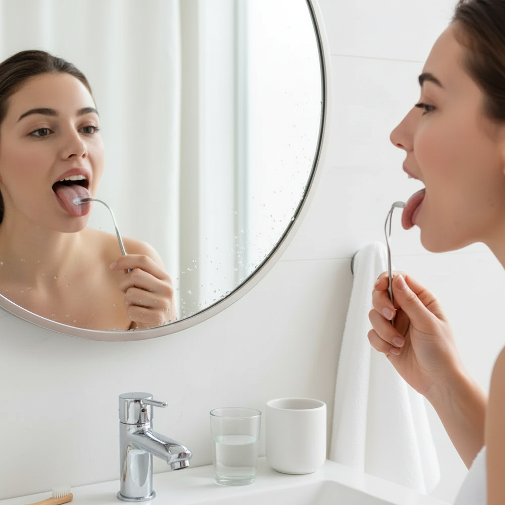 Fato científico: Cerca de 80-90% das bactérias causadoras do mau hálito ficam acumuladas na língua, especialmente na parte posterior. A escova de dentes sozinha não consegue removê-las eficientemente!
